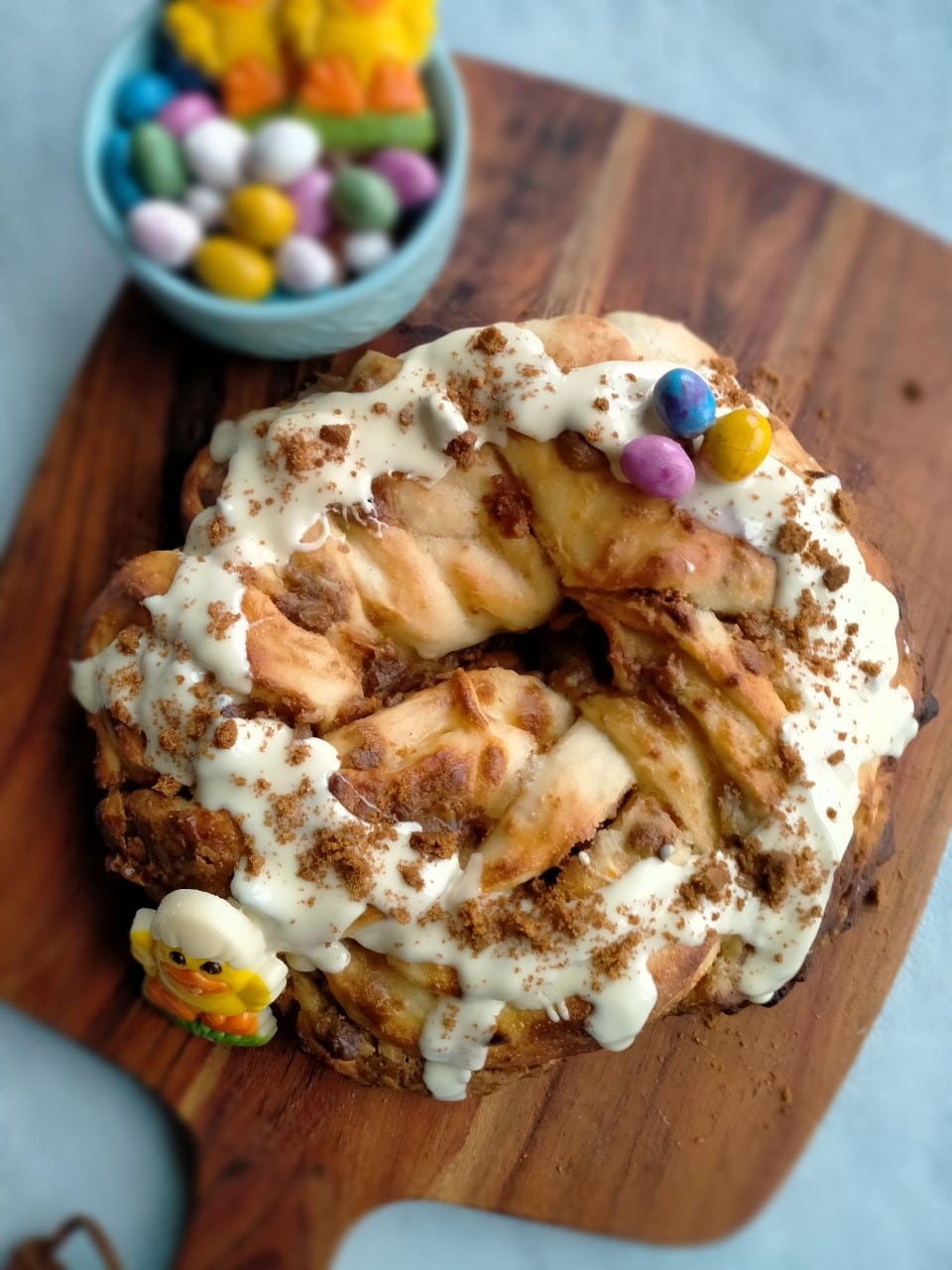Broodkrans met banketbakkersroom, speculoos en witte chocolade.